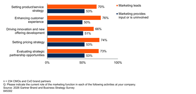 Where marketing does lead these activities, organizations are more likely to report strong brand strategy performance, defined as brand being fully aligned with business strategy, consistently executed across functions, and recognized by executive leadership as critical to both past and future growth (see Figure 1).