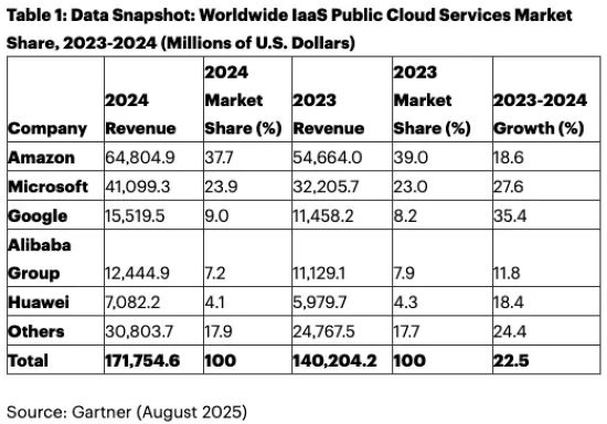 The worldwide infrastructure as a service (IaaS) market grew 22.5% in 2024, reaching $171.8 billion, according to Gartner. Amazon retained the No. 1 position in the IaaS market in 2024, followed by Microsoft, Google, Alibaba and Huawei.